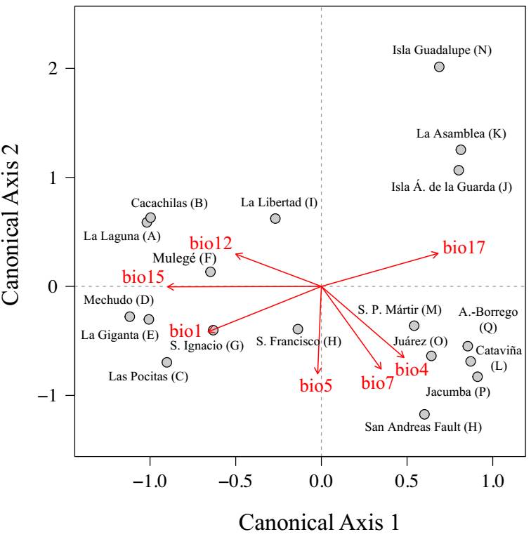 Figure 6 Distance-based redundancy analysis (dbRDA) showing the relationship between floristic composition (Sørensen dissimilarity index) and climatic gradients across 18 palm grove areas in southern California and the Baja California Peninsula. Circles represent areas and red arrows indicate the direction and strength of significant bioclimatic variables. Variable codes (from WorldClim): bio1 = annual mean temperature, bio4 = temperature seasonality, bio5 = max temperature of warmest month, bio7 = annual temperature range, bio12 = annual precipitation, bio15 = precipitation seasonality, bio17 = precipitation of driest quarter.