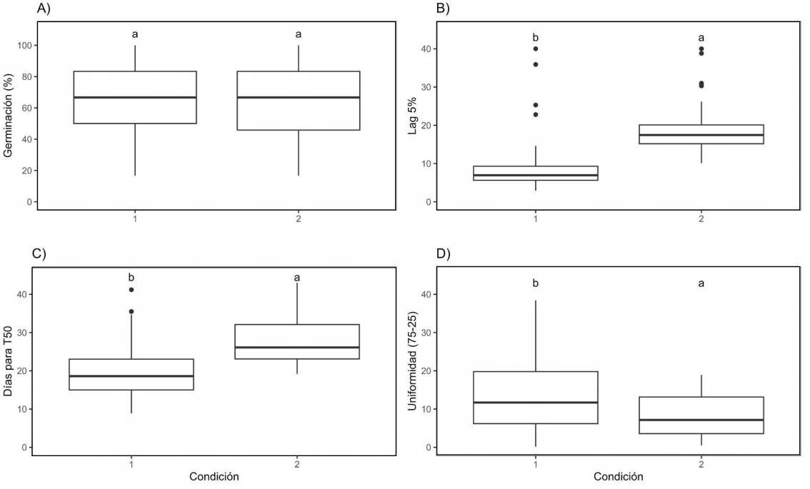 Un aspecto relevante es conocer si la condición experimental (laboratorio o invernadero) influye en la respuesta de las semillas a diferentes tratamientos pre-germinativos y con ello fortalecer el diseño de protocolos de propagación de planta para fines de restauración o de conservación (El-Kassaby et al. 2008, Iralu et al. 2019, Kavanova et al. 2023).