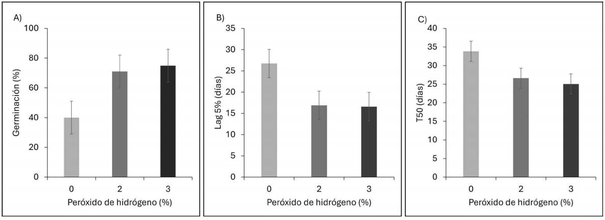 Efecto del factor peróxido de hidrógeno.- A diferencia de la condición de laboratorio, en invernadero, la aplicación de H 2 O 2 en una concentración del 2 o 3 % mejoró la germinación en un 35 % (Figura 2A), permitió acelerar el inicio de la germinación, reduciendo el valor de Lag 5% en 6 días (Figura 2B) y redujo el tiempo a T 50 en 8 días, respecto al testigo (Figura 2C).