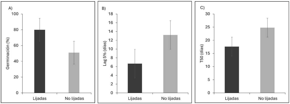 Figura 3 Efecto de la escarificación (semillas lijadas y no lijadas) en A) germinación, B) retraso al inicio de la germinación (Lag 5%), C) tiempo en germinar el 50 % de semillas viables (T 50 ) de Pinus coulteri, en condición de laboratorio.