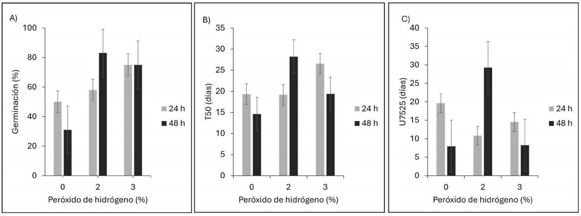 En laboratorio, la interacción H × P modificó el valor de T 50 , el efecto 24 h de hidratación al 0 y 2 % de H 2 O 2 no fue diferente de hidratar 48 h con una concentración del 3 %, sin embargo, se obtuvo un valor menor de T 50 (tiempo más corto) con hidratación durante 48 h sin H 2 O 2 (Figura 4B). En relación con la uniformidad, al aumentar el periodo de hidratación de 24 h a 48 h, sin la aplicación de H 2 O 2 , aumentó la homogeneidad de la germinación (i.e., se redujo el valor de U 7525), mientras que al aplicar 2 % de H 2 O 2 se redujo de manera significativa con la hidratación a 24 h; en cambio, cuando se agregó 3 % de H 2 O 2 , el aumento en el periodo de hidratación no afectó la uniformidad de germinación (Figura 4C).