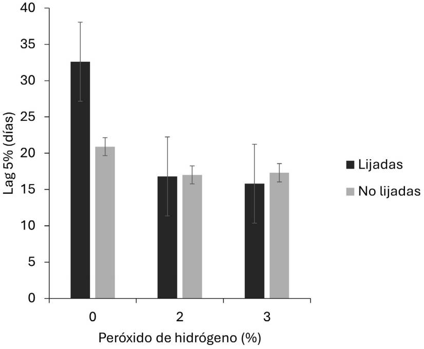 Efecto de la Interacción de los factores Peróxido de hidrógeno × Escarificación.-La interacción peróxido de hidrógeno × escarificación fue significativa para la variable Lag 5% en la condición de invernadero, disminuyendo entre 22 y 16 días el tiempo al inicio de la germinación en semillas sometidas a concentraciones de 2 y 3 % de H 2 O 2 indistintamente del nivel de escarificación de las semillas (Figura 5). En esta condición la escarificación de la semilla no es relevante si no se combina con la aplicación de H 2 O 2 . Sin embargo, un retraso a la germinación de 16 días es mucho tiempo comparado con otros tiempos como el obtenido al escarificar la semilla en condiciones de laboratorio, ya que el valor de Lag 5% fue de 6.5 días.