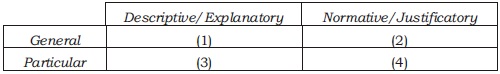 Furthermore, the clarification suggests that since there are there two axis the one distinguishing general and particular legal theories, and the other descriptive / explanatory and normative / justificatory legal theories there are four resulting quadrants that correspond to four initial possibilities: (1) general and descriptive / explanatory legal theories; (2) general and normative / justificatory legal theories; (3) particular and descriptive / explanatory legal theories; and (4) particular and normative / justificatory legal theories. Moreover, nothing precludes a more comprehensive legal theory that includes more than one quadrant and that correspond to four additional possibilities combining: (1) and (2); (3) and (4); (1) and (3); and (2) and (4); and, even a much more comprehensive theory that integrates the four quadrants and a further possibility combining: (1), (2), (3), and (4).18