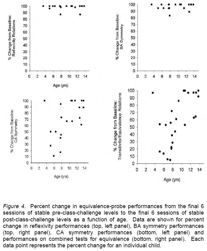 Figure 4 presents performances for each child on probe trials testing for each of the properties of equivalence following the AC class challenge. The data are expressed as percent change from the stable pre-class challenge performances (that is, the difference between the means for the final 6 sessions of the pre- and post-class challenge probe conditions). There was little evidence of change in either reflexivity or BA-symmetry performances for children at any age (see top panels of Figure 4; for the relation between reflexivity performances and age, r(23) = 0.03, p = .88; for BA symmetry patterns, r(23) = 0.20, p_= .39). In contrast, performances on CA-symmetry (see bottom, left panel) and transitivity/equivalence trials (see bottom, right panel) showed much more change, at least among the older children. In both cases, there was a strong positive correlation between age and percent change from baseline (for CA symmetry, r(23) = 0.53, p = .014; for transitivity/equivalence, r(23) = 0.58, p = .001). In general, children 10 and above approached 100% change on both measures; for example, on CA-symmetry trials with C1 as sample, comparison A3 was chosen almost exclusively, while A1 was chosen given C2 as sample, and A2 was chosen given C3 as sample. Similar changes occurred on the BC and CB transitivity/equivalence trials which are presented together in Figure 4. In short, the older children tended to demonstrate new classes following the AC challenge, as evidenced by emergent probe patterns that were consistent with the new contingency.