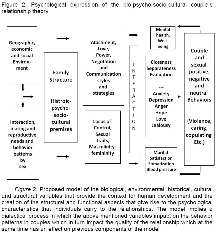 Given the diversity, the importance and the influence of intimate relationships on survival, evolution, and well-being for human beings, a theoretical and empirical approximation that permits the scrutiny of their significance, dynamics and functionality from a perspective that incorporates multiple aspects as well as facets of the family, and that unites them in all of their complexity is needed. In fact, there are an endless number of proposals, empirical findings and theoretical concepts that unfortunately have displayed inconsistency, partiality and certain contradictions. This is especially true when the research does not consider some of the cultural values and norms of the sample from which the data were extracted. In response to the challenge, a systematic, rigorous, structural and functional historic-bio-psycho-socio-cultural model, that allows the definition, categorization, diagnosis, and therefore indicates the relationship and temporality of a series of variables related to human relationships has been advanced by Diaz-Loving and Sanchez-Aragon (2002; see Figures 1 and 2).