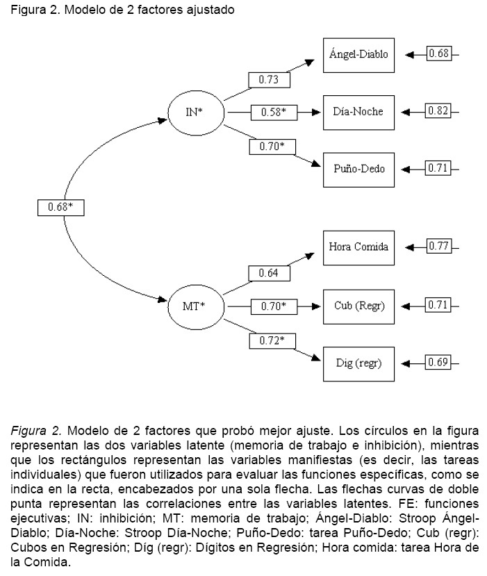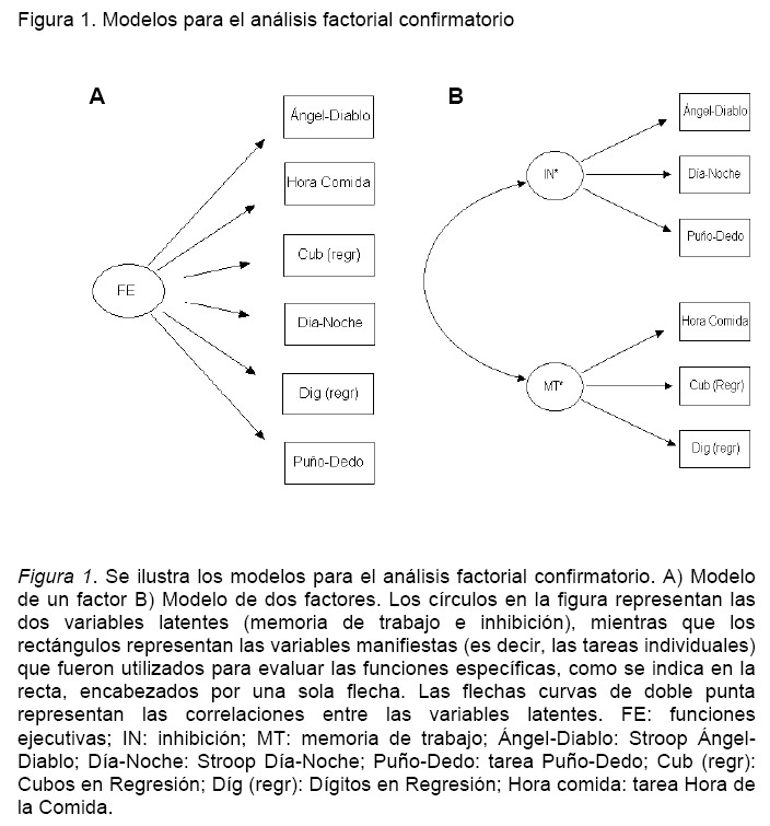 Para evaluar la estructura de las FE, primero se puso a prueba un modelo unitario donde todas las tareas se agrupan en un solo factor después se probó un modelo de dos factores: memoria de trabajo e inhibición (ver figura1).