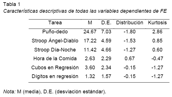 Todas las variables dependientes mostraron adecuadas características distribución y Kurtosis (ver tabla 1).