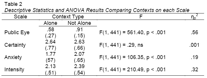 Individual-level analyses. We then computed an average score for contexts, separately for contexts where others were present or absent and for each of the four scale scores, and then computed 2 (Context Type: Alone v. Not Alone) x 2 (respondent sex) Analyses of Variance (ANOVA) on the scale scores, separately for each scale. The main effect of Context Type was significant for Public Eye, Anxiety, and Intensity, but interestingly not significant for Certainty (table 2). No other effects were significant.