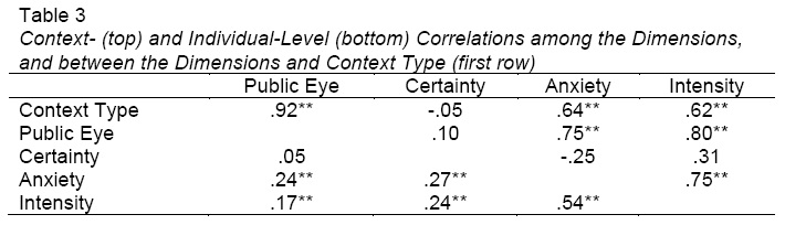 Context-level analyses. To examine whether the dimensions differentiated context on the context level, we classified contexts according to their type (i.e., alone v. not alone), and computed correlations between context type and the means of each of the four scales (first row, table 3). Context Type was associated with Public Eye, Anxiety, and Intensity, but interestingly not with Certainty. We also computed the intercorrelations among the dimensions on both the context (top diagonal) and individual levels (bottom diagonal). Interestingly, certainty was not correlated with the other dimensions in either analysis.