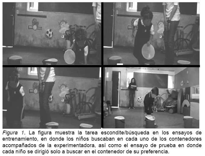 La tarea consistió en encontrar calcomanías en tres contenedores ubicados en el salón de clases. El ensayo daba inicio cuando se entraba al salón de clases con cada uno de los niños. Se les llevó de la mano a visitar los contenedores para que ellos los destaparan, se les pedía que dijeran qué estaba dentro, una vez que dieran su respuesta se les pedía que contaran el contenido. A continuación se les pidió que taparan de nuevo el contenedor y se les llevo de la mano al siguiente contenedor. De ésta manera se visitaron los 3 contenedores (A, B y C), después se llevaba afuera del salón a los niños y daba inicio el siguiente ensayo. El orden de inicio de las visitas a los contenedores fue semi aleatorio a lo largo de los 5 ensayos de cada fase. La fase de prueba se realizó en un ensayo en donde se les pidió a los niños que fueran desde la puerta de la habitación hacia los contenedores y destaparan aquel en donde se encontraban las calcomanías con las que quisieran quedarse. Una vez terminada la tarea se les obsequió a los niños una planilla de calcomanías. La figura1 muestra imágenes de los niños realizando la tarea experimental.