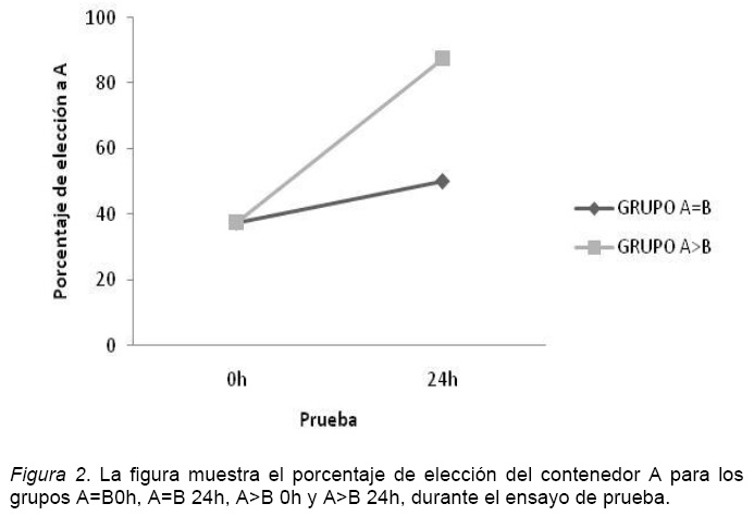 Los resultados se muestran en la Figura 2, donde se observa el porcentaje de elección al contenedor A en cada uno de los grupos. En los grupos A=B 0h, A>B 0h y A=B 24h los participantes eligieron ambos contenedores por igual, mientras que en el grupo A>B 24h los participantes eligieron el contenedor A.