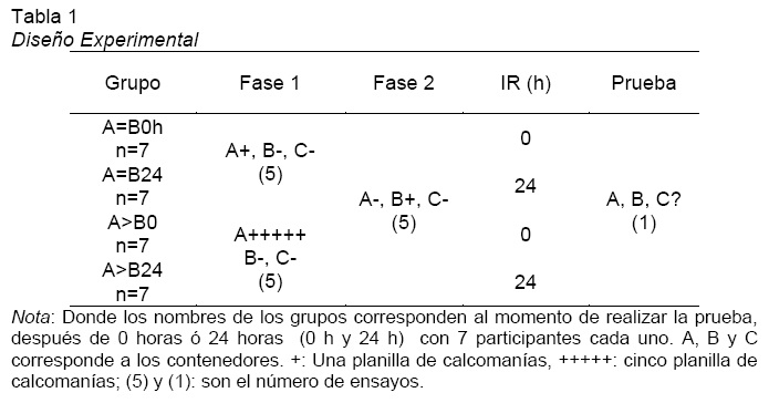 El diseño experimental se muestra en la Tabla 1. Durante la fase 1 el contenedor A contuvo las planillas de calcomanías, dependiendo del grupo pudo contener 1 o 5 planillas, durante los 5 ensayos, Mientras los contendores B y C se mantenían vacíos. Durante la fase 2 sólo el contenedor B contuvo 1 planilla durante los 5 ensayos, en todos los grupos (grupos A=B y A>B). La fase de prueba se realizó en cada una de las condiciones de grupo, en un grupo a las 0 horas después del entrenamiento y en otro a las 24 horas dando origen a los grupos A=B 0h, A=B 24h, A>B 0h, A>B 24h. Los grupos se conformaron con 8 participantes cada uno.