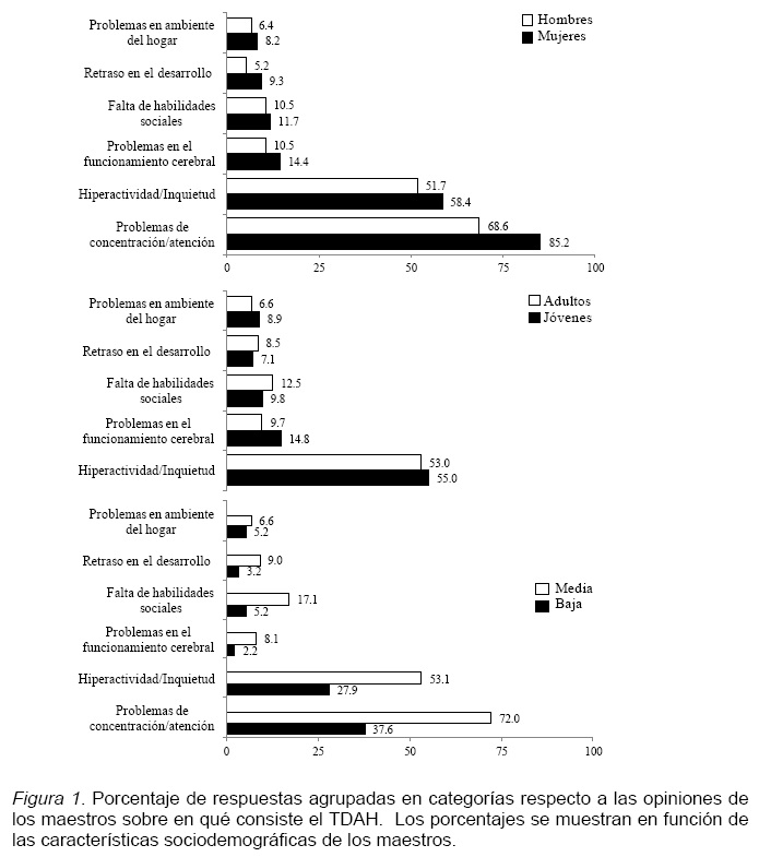 Curiosamente, independientemente de sus características sociodemográficas, la mayoría de los maestros tendió a decir que el TDAH se refiere, como su nombre lo indica, a problemas de atención (e.g., cortos periodos de atención, dificultad para terminar tareas, distracción fácil) y a hiperactividad (e.g., inquietud y dificultad para mantenerse sentado). En cambio, no hicieron alusión a conductas de impulsividad, que no están incluidas en el nombre del TDAH. Los maestros también mencionaron respuestas que se incluyeron en otras categorías que se denominaron problemas en el funcionamiento cerebral (i.e., desequilibrio funcional o químico en el cerebro, enfermedad cerebral), falta de habilidades sociales (i.e., agresivo y dificultades para relacionarse con los demás), retraso en el desarrollo (i.e., dificultad para seguir instrucciones o para aprender y falta de interés) y problemas en el ambiente del hogar (i.e., conductas inapropiadas aprendidas en la casa, no mide el peligro, grosero).