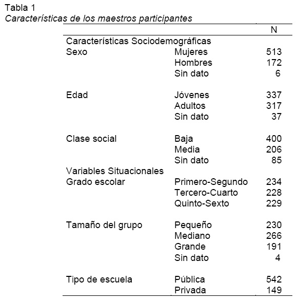 Participaron voluntariamente 691 maestros de 64 escuelas primarias de la ciudad de México. De ese total, un 78.5% laboraba en escuelas públicas y un 21.5% en escuelas privadas. La mayoría fueron mujeres (74.2%) y sólo el 25.0% fueron hombres. La edad de los maestros varió entre 22 y 70 años y se los clasificó como jóvenes (entre 22 y 42 años) o adultos (entre 43 y 70 años). Conforme con los criterios de la Asociación Mexicana de Agencias de Investigación de Mercados y Opinión Pública (AMAI, López Romo, 2006), se clasificó a los maestros en su respectiva clase social. Aquellos clasificados como de clase baja reportaron un ingreso familiar mensual menor a 10,000 pesos mexicanos y como de clase media a quienes reportaron un ingreso familiar mensual entre 10,001 y 30,000 pesos. No se contó con maestros de clase alta que reportaran un ingreso mayor a los 30,000 pesos. Aproximadamente un tercio de los maestros estaba a cargo de grupos de primero y segundo, de tercero y cuarto o de quinto y sexto de primaria. Conforme el número de alumnos que atendían, se consideró un grupo pequeño cuando estuvo integrado por entre tres y 29 estudiantes, grupo mediano al integrado por entre 30 y 38 alumnos y grande cuando incluyó a entre 39 y 60 alumnos. En la Tabla 1 se muestran las características de los participantes.