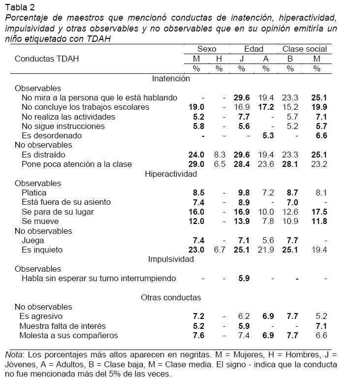 En la Tabla 2 se muestra el porcentaje de maestros considerando sus características sociodemográficas que mencionó diferentes conductas que creen que emitiría un niño etiquetado con TDAH. En negritas se muestran los porcentajes más altos. En la tabla las conductas mencionadas por los maestros están clasificadas en conductas de atención, hiperactividad, impulsividad y otras, observables y no observables. Seis jueces independientes clasificaron las conductas y en la tabla se muestran los datos del par de jueces cuyo acuerdo fue del 80%. En la tabla se muestran los datos del par de jueces cuyo grado de acuerdo fue el mayor. Los datos de la Tabla 2 muestran que las mujeres, los jóvenes y los de clase social media esperarían un peor comportamiento de los niños etiquetados con TDAH que sus contrapartes.