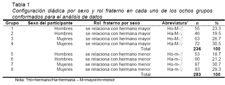 Se generaron ocho grupos a partir de la configuración diádica por sexo y rol fraterno (Tabla 1). Cabe destacar que hubo participantes quienes podían tener tanto hermano/a mayor como menor, esto implica que algunos participantes pudieron ubicarse en alguno de los primeros cuatro grupos y también pertenecer a otro de los grupos entre el cinco y el ocho. Por tanto, solamente se compararon intra grupalmente los grupos 1-4 y 5-8.