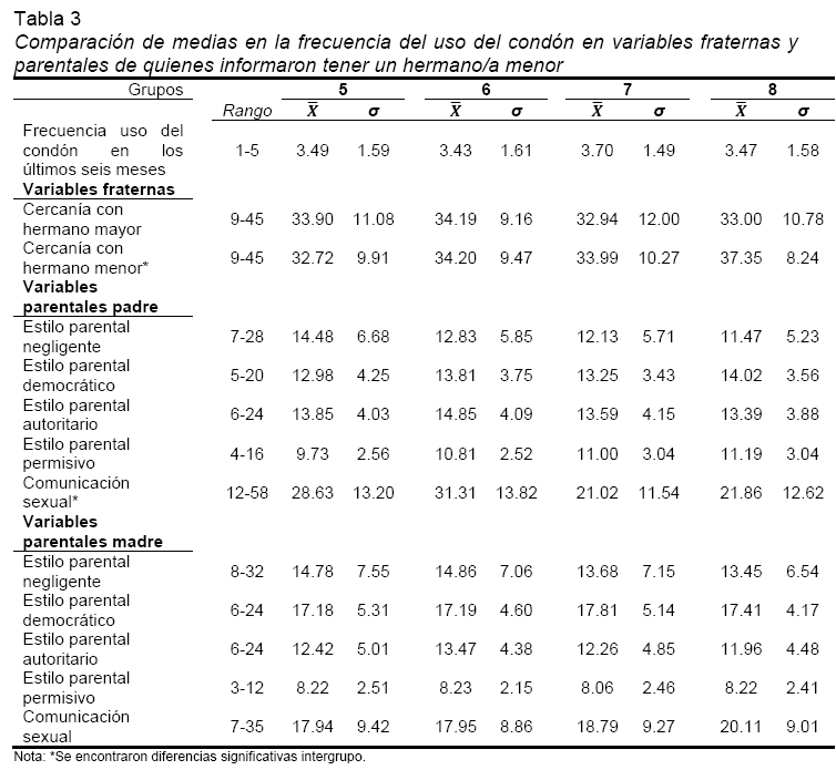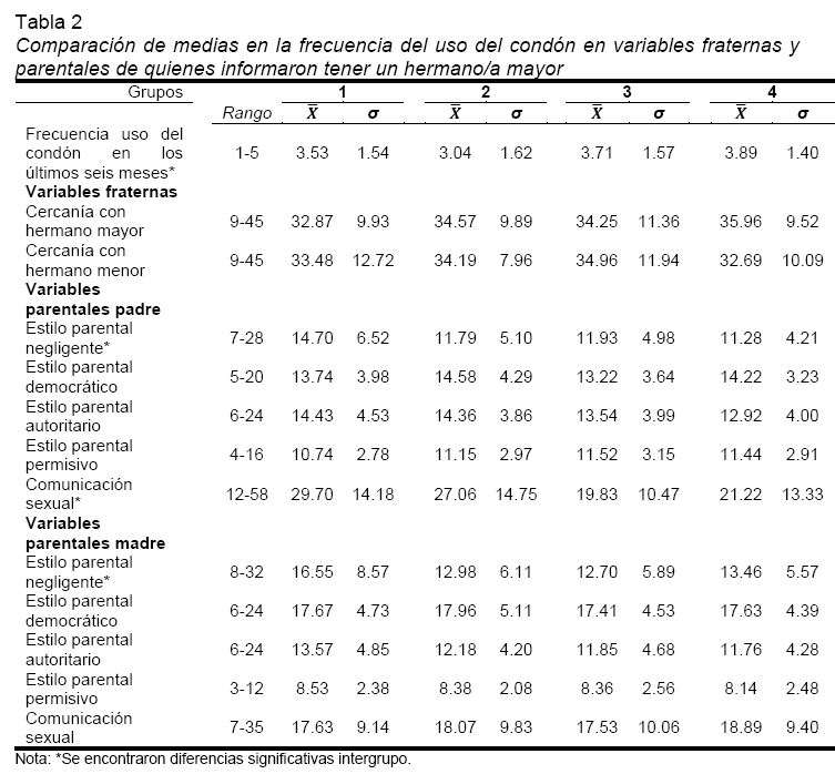 Respecto a la cercanía fraterna por díadas del mismo sexo se coincide con lo reportado en la literatura respecto a que las diada del mismo sexo tienen mayor nivel de cercanía (Diop-Sidibe, 2005; Wallace, 2008). También es congruente el resultado de que las diadas de mujeres tienen mayor cercanía que las diadas de varones (Kowal & Blinn-Pike 2004). Este resultado puede vincularse a la frecuencia del uso del condón. Solamente se encontraron diferencias significativas en las medias estadísticas del grupo de mujeres quienes informaron tener una hermana mayor. Si las relaciones entre diadas del mismo sexo son estrechas, especialmente las de mujeres (Kowal & Blinn-Pike 2004) entonces según Diop-Sidibe (2005) y Wallace (2008) hay mayor compatibilidad, calidez y cercanía, por tanto, es común encontrar mayor influencia fraterna en el comportamiento sexual. Sin embargo, con el presente estudio no se puede determinar si estas hermanas mayores tienen una alta frecuencia en el uso del preservativo y si esta condición influye en el comportamiento sexual protegido de sus Ha-m-♀. Sería importante obtener información de ambas partes de la díada fraterna para realizar este tipo de análisis.