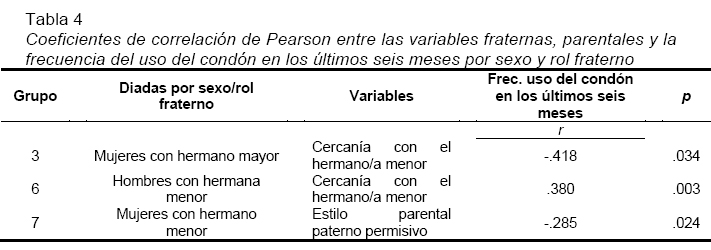 Se calculó el coeficiente de correlación de Pearson entre las variables fraternas y parentales con la frecuencia del uso del condón en los últimos seis meses en cada uno de los ocho grupos. No se encontró ninguna correlación de estas variables en los grupos 1, 2, 4, 5 y 8. Sin embargo, el análisis de correlación determinó una asociación positiva entre la frecuencia del uso del condón y la cercanía con la hermana menor en varones (grupo 6). Asimismo, se obtuvo una correlación negativa entre la frecuencia del uso del preservativo y la cercanía fraterna en mujeres que tienen un hermano mayor pero poca cercanía con el hermano/a menor (grupo 3). Por último, se encontró una correlación negativa entre la frecuencia del uso del preservativo con el estilo parental permisivo paterno (Tabla 4).