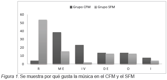 Las diferencias del por qué gusta la música entre ambos grupos fueron estadísticamente significativas (X2=36834, p<. 0001). Para el grupo CFM, con el 38.5% la música gusta por ser un medio de expresión, mientras que al grupo SFM con el 15.37%; con el 23% para el grupo CFM por ser importante en su vida (en ésta respuesta dijeron, que era importante en su vida porque en su familia son músicos, o porque siempre tuvieron un nexo muy fuerte con la música desde pequeños) y al grupo SFM con el 1.99%, en cambio, a los individuos del grupo SFM, la música les gusta con el 53.8% por que les relaja, mientras el grupo CFM solo tuvo en éste ítem el 3.8%. Los demás ítems tuvieron respuestas casi a la par entre ambos grupos.