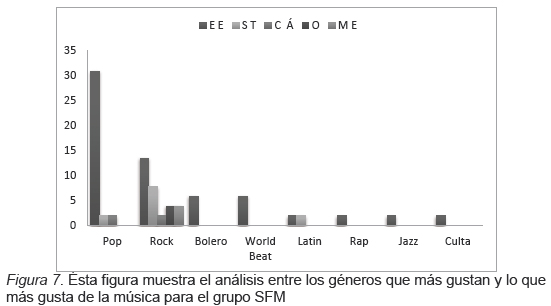 En la Figura 7 se presenta lo que gusta más para el grupo SFM con relación a los géneros que más les gustaron. Las respuestas incidieron en que el pop gusta más por los E E. En todos los géneros los E E se mencionaron, y sólo en el rock se señalaron las otras cuatro opciones.
