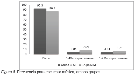Escuchar música es una actividad que la mayoría de las personas le dedican tiempo diariamente. El grupo CFM (92.3% indicó que escucha música diariamente) dedica más tiempo a escuchar música que el grupo SFM (86.5% indicó lo mismo). Este resultado se asocia a lo que encontraron Rentfrow y Gosling (2003), de que las personas consideran la música un aspecto importante de sus vidas y escuchar música una actividad que hacen muy frecuentemente.