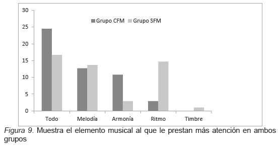La Figura 9 presenta el elemento musical al que le prestan más atención cuando escuchan música. Se encontraron diferencias estadísticamente significativas entre ambos (X2= 15.099, 4, p<.005). En cuanto a la armonía, el grupo CFM le pone más atención a esta que el grupo SFM; en cuanto al ritmo fue al contrario, el grupo SFM le pone más atención a este elemento que el grupo CFM. Así mismo, hay más personas del grupo CFM que ponen más atención a todos los elementos que el grupo SFM.