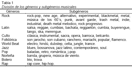 En ésta investigación nos centraremos en dos géneros musicales, el culto y el popular. El culto, Sobrino (2000), lo define como un adjetivo empleado para clasificar la música clásica o artística, sin distinción de época. La música popular, por su parte, es definida por Pareyón (2007), como aquellos estilos musicales transmitidos por los medios de comunicación masiva y que se producen en grandes cantidades por métodos industriales y comerciales similares a los de cualquier otro artículo de consumo, son de carácter simplista, sentimental y sensual, lo cual facilita su pronta expansión. Hormigos y Cabello (2004), encontraron que la música popular, aunque forma parte del mercado destinado a la juventud, no es una simple mercancía, es un hecho cultural que ayuda a percibir el mundo y constituye una forma de expresión. Convirtiéndose en un nuevo mercado, expresión del espíritu hedonista característico del capitalismo avanzado, mediante el cual se pueden analizar los procesos identitarios en los que está inmersa la juventud.
