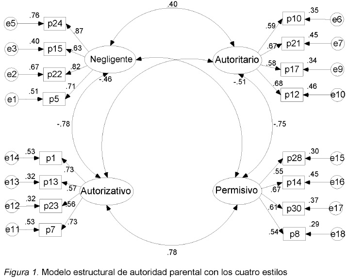 Ambos modelos presentaron buen ajuste a los datos, pero el modelo de cuatro factores requirió la eliminación de tres reactivos del estilo autoritario, dos del negligente y del autorizativo y uno reactivo del permisivo (ver Figura 1 y Apéndice).