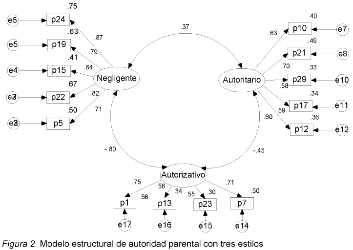 Por su parte el ajuste del modelo de tres factores requirió la eliminación de dos reactivos del autoritario y dos del autorizativo, así como un reactivo del negligente (ver Figura 2). Los índices de ajuste de los dos modelos se muestran en la Tabla 2.