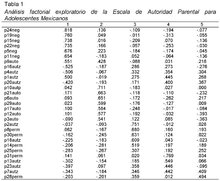 El análisis de componentes principales de los 29 ítems de la escala produjo una solución de cinco componentes que explican el 53.75% de la varianza por medio de una rotación varimax. El primer componente tiene un valor propio de 8.83, explica 30.47% de la varianza e incluye 6 ítems, cuyo significado expresa negligencia, y sus cargas son superiores a .60. El segundo componente con un valor propio de 2.99, explica el 10.32% de la varianza y está formado por 7 ítems que indican autoritarismo con cargas mayores a .50. El tercer componente con un valor propio de 1.61, explica 5.55% de la varianza; incluye 3 ítems de permisividad con cargas mayores a .50 y dos con cargas mayores a .30; además, cuatro reactivos de autorizividad con diversas cargas. El cuarto componente tiene un valor propio de 1.08 y explica el 3.74% de la varianza; incluye 6 ítems que indican autorizividad con cargas mayores a .35, de los cuales dos de ellos aparecen, también, en el componente tres. El quinto componente explica el 3.66% de la varianza, con un valor propio de 1.06; únicamente incluye dos reactivos, uno de autorizativo y otro de permisividad, por lo cual se eliminó dicho componente (ver Tabla 1).