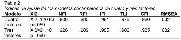 Con base en los resultados obtenidos se decidió realizar dos análisis factoriales confirmatorios, uno con cuatro factores y otro con tres.