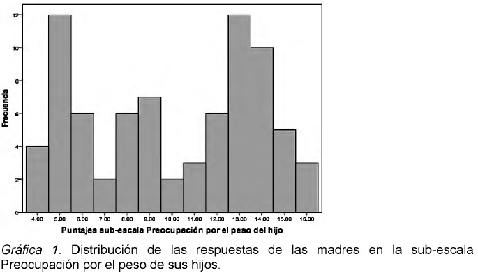 Al analizar la distribución de frecuencias de la preocupación de las madres por el peso de sus hijos, se encontró que aunque la mayoría de las madres tendieron a puntuar alto en el cuestionario, otro grupo de madres indicaron una baja preocupación por el peso de sus hijos (ver Gráfica 1).