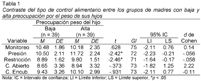 Por tal razón, se decidió dividir al grupo de madres en dos grupos: madres con baja preocupación (puntajes de 4 a 10) y madres con alta preocupación (puntajes de 11 a 16) por el peso de sus hijos. Por medio de pruebas t de Student para muestras independientes se realizaron comparaciones con el control alimentario que ejercen hacia la alimentación de sus hijos. En este rubro se observó que las madres que se encuentran más preocupadas por el peso de sus hijos los presionan más para comer y les restringen más la alimentación, que las madres que se encuentran menos preocupadas. En cambio, no se encontraron diferencias en el grado de monitoreo que llevan a cabo, ni en la forma en la cual controlan la alimentación, es decir, si lo hacen abierta o encubiertamente (ver Tabla 1).