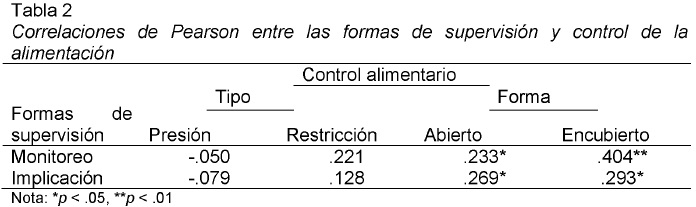 En cuanto a las formas de supervisión alimentaria (monitoreo e implicación de la madre en cuestiones relacionadas con la alimentación), se encontró asociación significativa entre ambas (r = .578, p < .001), así como entre dichas formas de supervisión y la manera en la cual ejercen el control de la alimentación de sus hijos (abierto y encubierto); en cambio, no se encontró asociación entre la tendencia de las madres a supervisar la alimentación de sus hijos, y el tipo específico de control alimentario que llevan a cabo (presión para comer o restricción alimentaria) (ver Tabla 2).