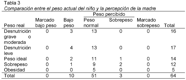 También se le solicitó a las madres el peso y la talla actuales de sus hijos, con la finalidad de obtener a partir de esos datos la categoría real del peso de sus hijos en términos del "peso para la talla" según la OMS, y realizar una comparación con la percepción que las madres reportaron acerca del peso corporal de sus hijos. Para realizar esta comparación únicamente se tomaron en cuenta los casos en los cuales se contó con el peso y la talla del niño, así como la percepción de las madres (n = 64). Una prueba de Wilcoxon se encontraron diferencias estadísticamente significativas entre la percepción de las madres y el peso real de sus hijos (z = -3.162, p = .002). Como puede observarse en la tabla 3, la mayoría de las madres cuyos hijos presentaban desnutrición, sobrepeso u obesidad, los percibieron como normopeso. Únicamente siete de 33 madres percibieron correctamente el peso de sus hijos en bajo peso, y dos de 12 madres percibieron correctamente el peso de sus hijos con sobrepeso.