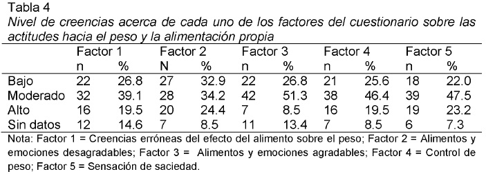 La mayoría de las madres presentaron un nivel bajo o moderado en cada una de las actitudes evaluadas. Pocas o moderadas creencias erróneas sobre el efecto que el alimento puede tener sobre el peso corporal (factor 1), sobre la relación entre las emociones desagradables y la conducta de comer (factor 2), sobre la relación entre las emociones agradables y la alimentación (factor 3), sobre la creencia de que el control del peso es muy importante (factor 4), y sobre la iniciación de la conducta alimentaria aún cuando se tiene sensación de saciedad (factor 5) (ver Tabla 4).
