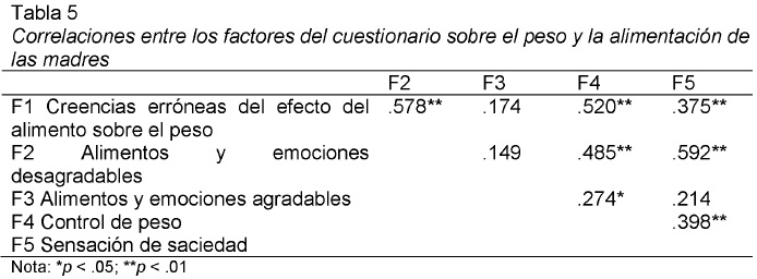 Por medio de correlaciones de Pearson se encontró que a más creencias erróneas de las madres acerca del efecto de los alimentos (por ejemplo, pensar que ganan peso "hasta por tomar agua"), mayor es la ingesta de alimentos cuando tienen emociones desagradables (por ejemplo, cuando se sienten tristes o enojadas), mayor ingesta de alimentos incluso cuando no tienen hambre, y mayor es la creencia de que el peso corporal y el control del mismo es importante. Asimismo, la sensación de que la alimentación conlleva emociones agradables se relacionó con la creencia de que el peso corporal y el control del mismo son importantes (ver Tabla 5).