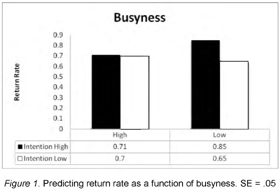To test our predictions of different effects of busyness, the proportion of returns over the two follow up sessions was analyzed as a function of intentions, busyness, the interactions between intentions and busyness, and control variables. The coefficients associated with this analysis appear in Table 2, and the estimated return means at a standard deviation above and below the means for intentions and busyness appear in Figure 1. As shown in Table 2, intentions had an overall positive association with retention but also interacted with busyness. Specifically, intentions predicted behavior when participants were less busy, but did not predict behavior among busy participants.