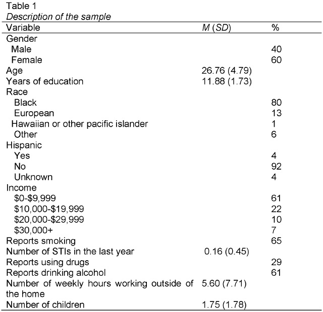 Five hundred and eighty-one eligible study participants attended the initial counseling session. Participants that were randomly assigned to complete or not complete the questionnaire at the end of the session were selected for our analyses. Thus, our analyses included data from 278 clients who completed the measures of return intentions. A description of the sample appears in Table 1 and indicates a predominantly African American, low-income, at-risk population.