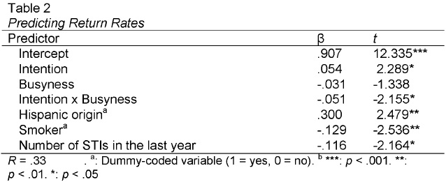 We hypothesized that intentions would predict retention more strongly when participants have control over their time than when they are burdened with work and family responsibilities. The importance of actual control over behavior has been emphasized in past work (Ajzen & Fishbein, 2005; Fishbein & Ajzen, 2010) and intentions are likely to influence behavior (for a recent demonstration, see Ajzen & Klobas, 2013) more when behavior is under conscious control (Neal & Wood, 2009). In contrast, actual counseling attendance may depend entirely on time availability or family responsibilities, thus decreasing the predictive power of intentions in those conditions. Importantly, highlighting this dynamic should demonstrate some of the conditions under which retention is in fact under the control of the individual, even in a sample that is vulnerable and relatively resource-deprived. The analyses we conducted entailed predicting return rates from return intentions and determining the degree to which busyness, measured by the number of hours participants worked and the number of children they had, moderates the intention-behavior relation.