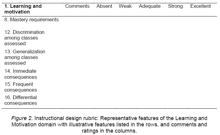 Each domain on the rubric can be commented upon and rated on the five-point scale listed on the top of the tool. We also expand each row or domain on the rubric to a set of features and rate and comment on each of these features. Figure 2 shows a representative subset of the 17 features of the Learning and Motivation domain. The features of Learning and Motivation come from a very strong tradition of experimental evidence. As we audit the instruction we ask: Does the instruction provide sufficient examples to test for discrimination between classes and generalization within classes of stimuli? Does the instruction include immediate, frequent, and differential consequences?