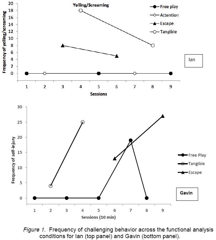 Functional analysis. The results of the functional analysis for Ian (top panel) and Gavin (bottom panel) are depicted in Figure 1. For Ian, a high frequency of yelling and screaming was observed during the tangible and escape conditions of the functional analysis. These results suggest that his problem behavior was maintained by access to positive reinforcement (preferred edibles), and negative reinforcement (escape from task demands). For Gavin, SIB was elevated in both the tangible and escape conditions, whereas it only occurred in one session of the control condition. These results suggest that Gavin's problem behavior was maintained by access to positive reinforcement (food or preferred items), and negative reinforcement (escape from tasks). In both cases, these functions were consistent with the observations of the research staff and the reports of caregivers with regard to the antecedents (task demands, denied access to preferred items) that frequently preceded instances of problem behavior for both participants, as well as the consequences (escape from demands, access to preferred items) that were frequently provided in order to calm the participants during or after episodes of problem behavior.