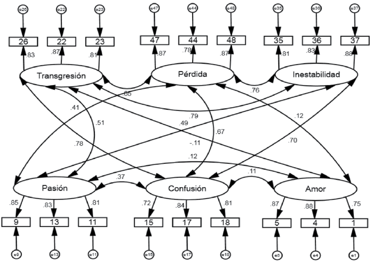 Figura 1 Modelo factorial confirmatorio de la versión corta de la Escala de Concepto de Infidelidad de seis factores relacionados. Estimaciones de los parámetros de máxima verosimilitud. El número colocado en los reactivos, corresponde al de la escala original