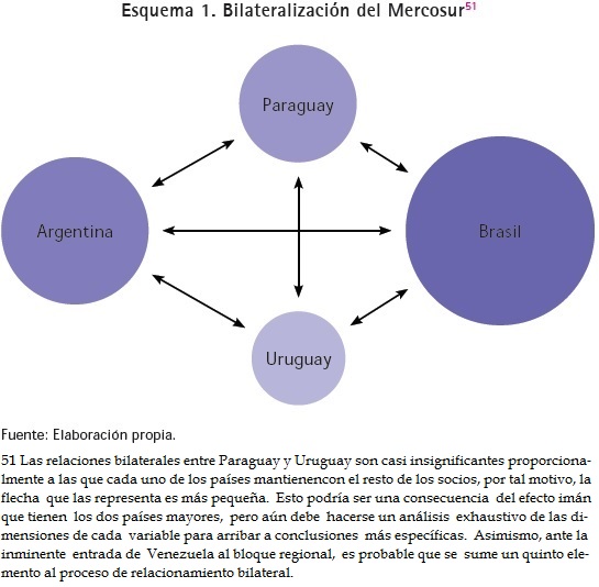 51 Las relaciones bilaterales entre Paraguay y Uruguay son casi insignificantes proporcionalmente a las que cada uno de los países mantienen con el resto de los socios, por tal motivo, la flecha que las representa es más pequeña. Esto podría ser una consecuencia del efecto imán que tienen los dos países mayores, pero aún debe hacerse un análisis exhaustivo de las dimensiones de cada variable para arribar a conclusiones más específicas. Asimismo, ante la inminente entrada de Venezuela al bloque regional, es probable que se sume un quinto elemento al proceso de relacionamiento bilateral.