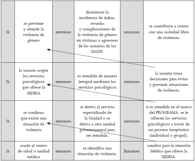Con la intersección de los datos empíricos y la revisión de la documentación del programa, sus reglas de operación y la normativa nacional e internacional sobre el tema de la atención a la violencia de género, principalmente orientada a las mujeres, la investigación permitió la elaboración de una matriz con la metodología de marco lógico como se muestra a continuación.