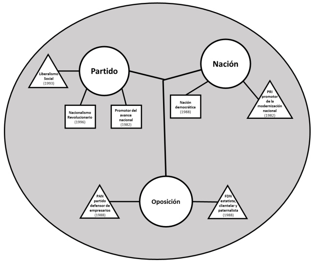 El marco de análisis de las ideologías partidarias propuesto aquí, está conformado por al menos tres categorías conceptuales: 1) partido; 2) nación, y 3) oposición (Figura 1). Estos tres conceptos constituyen el mínimo de conceptos centrales ineliminables en torno a los cuales se agrupa toda la densidad significativa de una ideología partidaria. Estas categorías conceptuales son de hecho guías metodológicas que permiten ir clasificando la información contenida en los discursos ideológicos para poder comprenderlos de manera coherente e integrada como una red conceptual que se desarrolla a través del tiempo. Tomando como guía estas categorías conceptuales es posible detectar el contenido empírico de una ideología partidaria dada en los diferentes formatos de expresión discursiva de la organización partidaria.