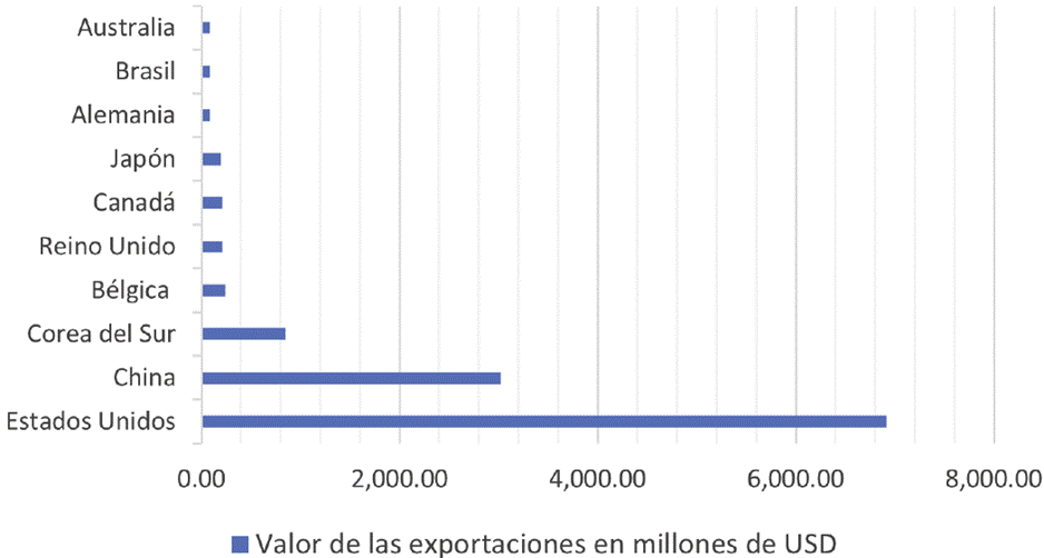 Nuestro país ejemplifica muy bien este punto, ya que el porcentaje de exportación de las commodities es aplastante. Según el Observatorio de Complejidad Económica (OEC), las principales exportaciones de nuestro país en 2021 fueron automóviles, cerveza de malta, higos, piñas, aguacates, guayaba, mangos y tomates, entre otros más49. Datos similares se reportan por la Secretaría de Agricultura y Desarrollo Rural50, mientras que la Organización Mundial de Comercio (OMC) reportó que las industrias que mayor crecimiento en exportación mostraron en México fueron la petrolera (5.2 %), la manufacturera (4.9 %) y el sector agropecuario (2.1 %)51. Respecto al destino de las exportaciones minero-metalúrgicas, dos naciones acaparan este terreno: Estados Unidos y China (Gráfica 1).