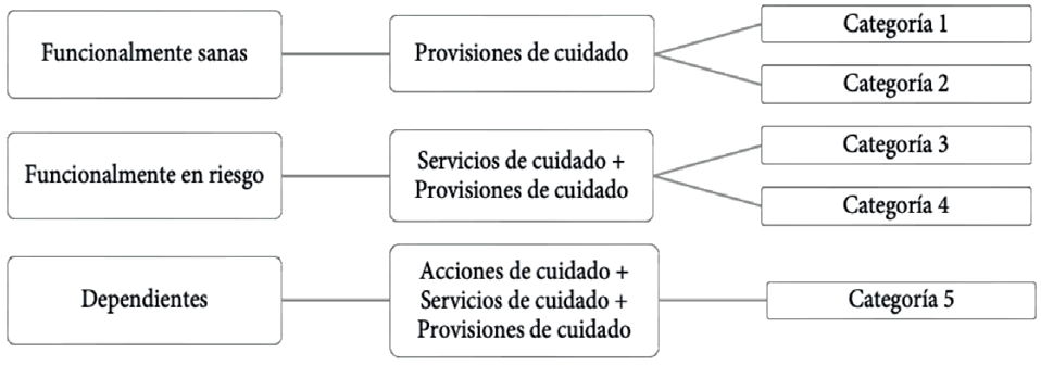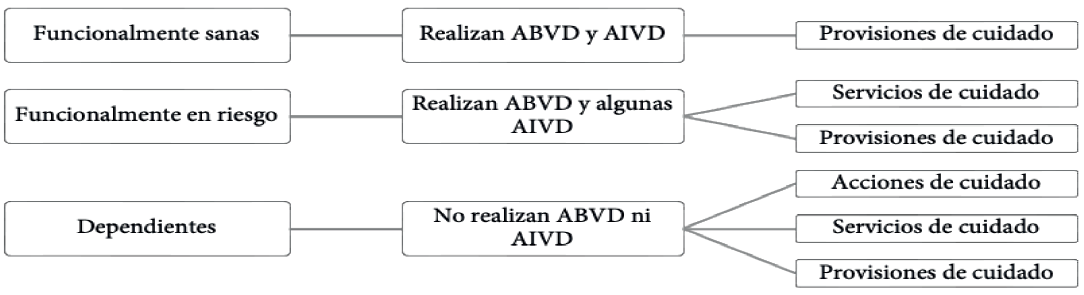 Las personas funcionalmente en riesgo, además de recibir provisiones de cuidado, requieren de servicios de cuidado para compensar las características innatas o adquiridas que representen algún factor de riesgo -por ejemplo, recibir ayuda para realizar la limpieza del hogar por presentar movilidad reducida, la necesidad de que le sean provistos medicamentos o terapias, etcétera-. Por último, las personas dependientes, además de recibir provisiones de cuidado y servicios de cuidado, requieren de acciones de cuidado debido a que no son capaces, por sí mismas, de realizar ABVD ni AIVD. Debido a la complejidad de los conceptos de cuidado y envejecimiento, esta propuesta no es irrefutable y puede ser susceptible de adaptaciones y mejoras.
