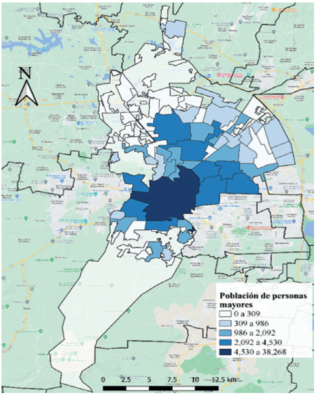 Se identificó que la población de personas mayores de Toluca se concentra en la mancha urbana central, como se muestra en la Figura 3. La mitad de la población de personas mayores se concentra en cuatro localidades (38.99 % en Toluca de Lerdo, 4.62 % en San Lorenzo Tepaltitlán, 3.93 % en Santa Ana Tlapaltitlán y 3.53 % en San Pablo Autopan), mientras que la otra mitad en el resto de localidades.49