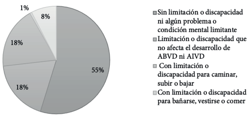 Al clasificar a esta población por grupos de acuerdo a la capacidad funcional, se identificó que cerca de tres cuartas partes son funcionalmente sanas -ya que no tienen limitación o discapacidad ni algún problema o condición mental limitante- o que tienen alguna limitación o discapacidad que no afecta el desarrollo de ABVD ni AIVD. Cerca de una quinta parte presenta alguna limitación o discapacidad para caminar, subir o bajar, por lo que se encuentran funcionalmente en riesgo grado 1. Por su parte, las personas funcionalmente en riesgo grado 2 y las personas dependientes son minoría (véase Figura 4).